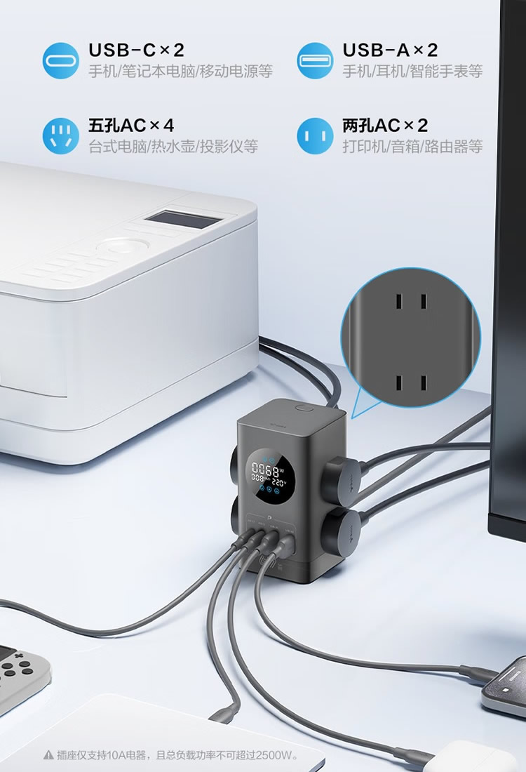 这个桌面充电站的左右两侧一共有4个3+2眼的交流电插孔,背后还有两个2眼的,一共有6个交流电插孔,这一点比很多的桌面充电站强太多了,其他品牌的要么只有氮化镓接口,根本就没有交流电插孔,要么只提供一两个交流电。我把一个电脑主机(3孔)和一个显示器(3孔)分别插在充电站的两边,起到重量平衡的作用,一个网络交换机(2孔)插在背面。这样交流电源一共插了3个,还剩下2个3+2眼和1个2眼插孔备用。你说巧不巧,这些电源插上之后,桌面充电站的高度正好卡在我显示器的底部边缘处,堪称天衣无缝。