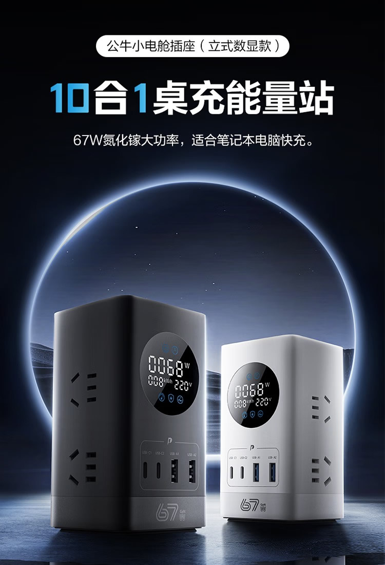 出于对电脑桌面整洁度的要求,我买了一个新出来的物品——桌面充电站。这个东西听起来很高大上,其实就是把传统的电源插排和新兴的氮化镓快速充电技术结合起来,做成的一个新型充电设备,不仅可以提供220V的交流电支持,又有手机、平板之类的氮化镓快速充电模式,算是一举两得吧。这次我也未能免俗,买了一个公牛品牌的67W立式桌面充电站,立式结构,相当小巧,不过价格要200多,倒是不便宜。