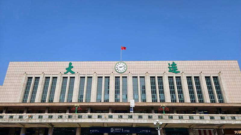 从东关街再往东,就到了达里安火车站了。这座火车站和国内的其他火车站有一个很大的不同点,其他的火车站一般是把红色的××站的字样放在前部的屋顶上,而达里安火车站则是把达里安这几个字漆成浅绿色,放在前部的墙面上,中间还放了一个大大的时钟,提醒着赶路的旅客时刻注意时间。据说这座火车站是仿造了日本东京的上野火车站来设计,我是没去过东京的上野火车站,不知道是真是假,不过这两座火车站的设计师是同一个人,那风格雷同就完全说得过去了。