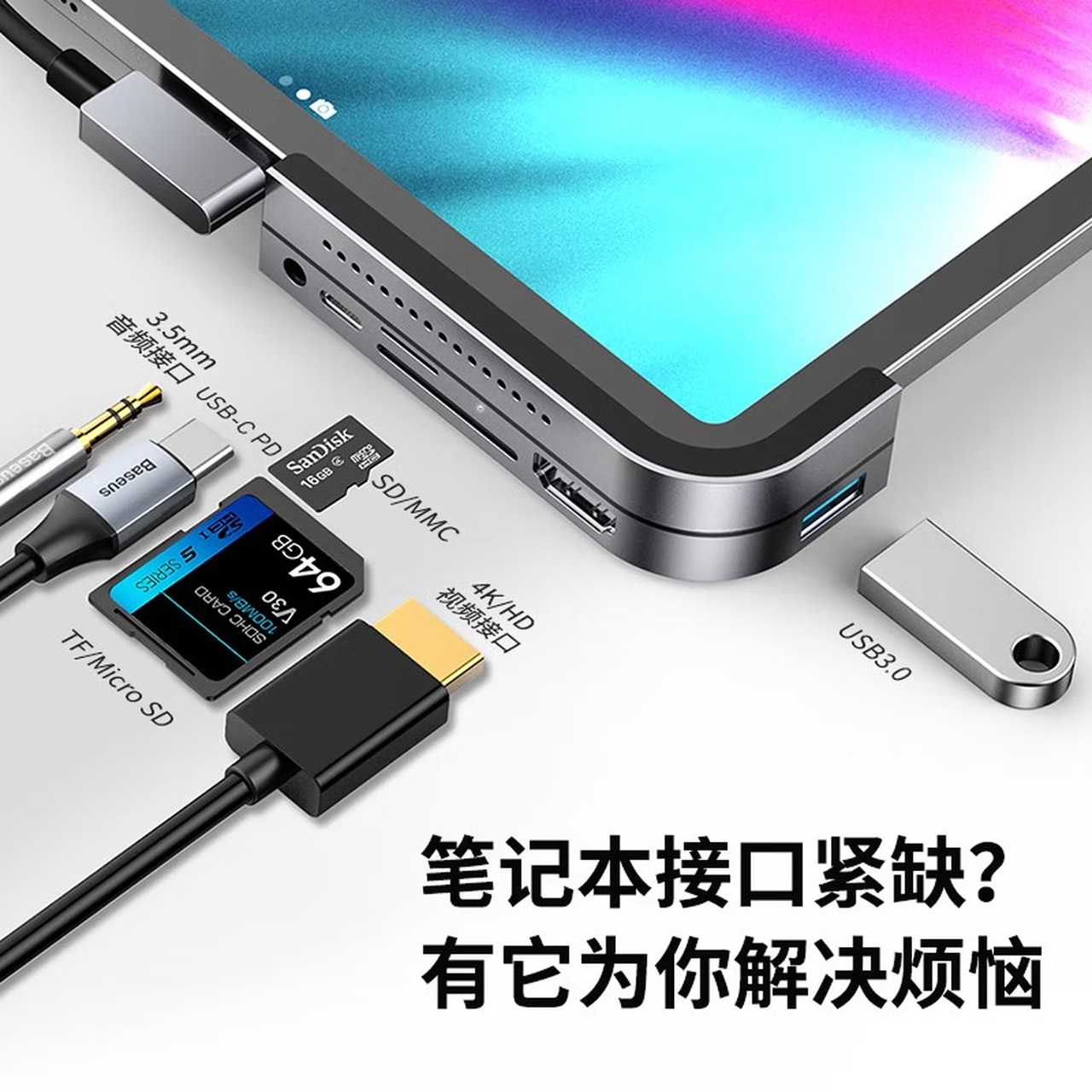 上面两款扩展坞都是针对笔记本电脑,我买的第三个扩展坞,不是为了笔记本,而是专门给iPad Mini 6用的,其实这款Baseus的扩展坞是为了iPad Pro而设计的,型号叫做GN39F。众所周知,新款的iPad、iPhone精简到只有一个Type-C口了,有线耳机和充电器就像鱼与熊掌一样不能同时使用,要么退而求其次,用蓝牙耳机。现在用了这个6合1扩展坞以后,可以愉快的一边听歌一边充电。我在南征北战时,在火车上或者飞机上,就是用有线耳机接了这个扩展坞来看iPad Mini 6里面的电影,两个小时下来,不知不觉间,电充满了,旅程也到站了。所以这款小小的扩展坞一直放在专门南征北战的包里面,陪伴我走过了大半个华夏大地。