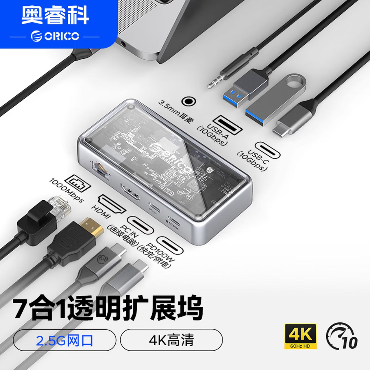 Acasis的这款实在太重了,所以我买的第二款扩展坞是Orico的TM10-7P,7合1,USB-A、Type-C、HDMI、耳机、网口、耳机口和PD充电口一应俱全。值得一提的是这个网口是2.5Gb的,比普通扩展坞自带的千兆网口要快2-3倍,正好和家里面已经布好线的2.5Gb网络环境无缝对接,所以我把它放到家里用。我看中这款的另一个原因是,这个扩展坞的外壳是透明的,可以看见里面的电子元件,有赛博朋克的风格。连上笔记本的Type-C接口之后,这个扩展坞还会发出幽幽的蓝色光芒,在晚上可以充当一个夜灯使用。