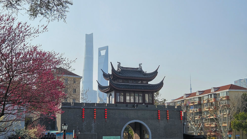 第二站,我来到了浦东的梅园公园,这是一个小小的街心花园,由于里面种植了很多株梅花而得名。有一句古诗说得好:遥知不是雪,为有暗香来。这两天的气温回升,大批量的梅花纷纷绽放,有白色胜雪的玉蝶梅、有粉色如霞的宫粉梅,还有红色似火的朱砂梅。不少游客都纷纷挤到梅花下面来拍照留念,其实梅园公园最著名的景点还不是绽放的梅花,而是公园门口有一座仿古的城楼,从某个角度进行拍摄的话,居然可以把仿古城楼和陆家嘴的摩天大楼一起拍进去,实现了不可思议的古今同框效果,堪称奇迹。