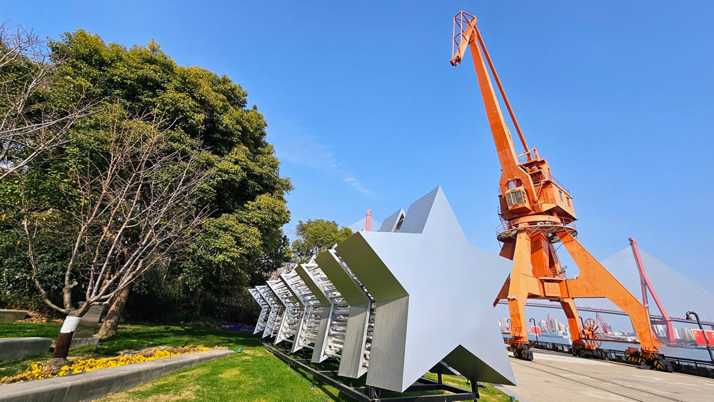 众所周知,外滩的英文叫The Bund,对面的浦东新区有前滩和后滩,北面的虹口滨江叫做北外滩,那么杨浦滨江这边就只能叫左滩了,英文是Left Bund。相对而言,杨浦滨江离陆家嘴金融区比较远,比起其他的滨江地带少了挺拔的厨房三件套身影和绝美的城市天际线。不过,杨浦区曾经是工业区,周边聚集了不少的工厂、仓库和码头,一出地铁站就可以看到由工业管道制成的电线杆,极目远眺还能看到橘黄色的大吊车和高耸入云的杨浦大桥桥墩,比其他滨江地带多了一丝废弃的工业风。