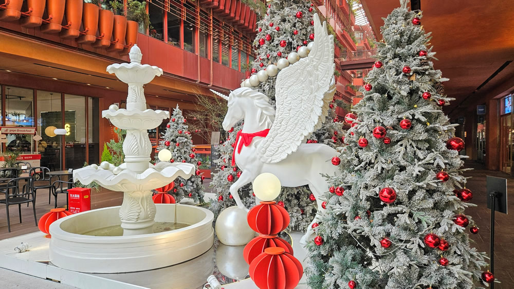 在春节假期的最后一天,我到了地名里有“马”这个字,寓意着一马当先的马当路。从地铁站出来之后,在马当路的拐角处我看见了一座大商场,这座大商场到处都是红色系的颜色,商铺是红色的、楼梯是红色的、地板是红色的,就连花瓶都是红色的,非常令人震惊。商场的老板为了破解赤马红羊劫,特地在商场的门口摆放了一座头上长角、身上长翅膀的飞马雕塑,这座雕像非常奇怪,既不是独角兽造型,又不是纯粹的飞马。好在这雕塑不是红色的,而是纯白色,否则的话都红到一起了,火气过大。